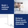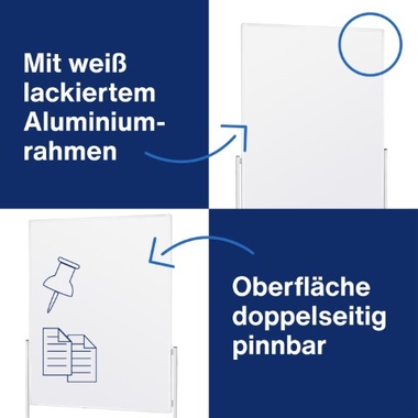 Doppelseitige Moderationstafel mit starrem Fußelement. Klappbar mobil (Tafel wird mit integriertem Rollensatz geliefert). Moderationstafel einteilig.